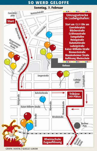 Vom ersten Motivwagen grüßte Miss Lu Sandra Krobath das Narrenvolk, in einem Cadillac sitzt die Pfälzer Weinkönigin Julia Kren. In der Kutsche folgt Elke König unsere Fremdenführerin. Böllerschützen der SG Schweisweiler kündigen nach der Aufstellung in der Leuschnerstraße um 13.11 Uhr den Start am Goerderlerplatz in Nord an. Vom Hemshof ging es in die Innenstadt. An der Bahnhofstraße befand sich die Ehrentribüne, wo unter anderem Ludwigshafens Oberbürgermeisterin Eva Lohse gemeinsam mit Mannheims Umweltbürgermeisterin Felicitas Kubala feierte. Die Löwenjäger, die ihren Après-Ski-Motivwagen mit einer Schaumkanone bestückt hatten, und das Mannheimer Stadtprinzenpaar, befanden sich in Mitten des Zuges.. Besonders viel Stimmung gab es, wenn die Guggenmusik-Gruppen, darunter auch die Ludwigshafener Huddelschnuddler und die Bensemer Roabdigalle-Guggenfetzband, vorbeifetzten. Um 17.15 Uhr endete der Umzug drei Kilometer weiter in der Rheinschule in Süd.