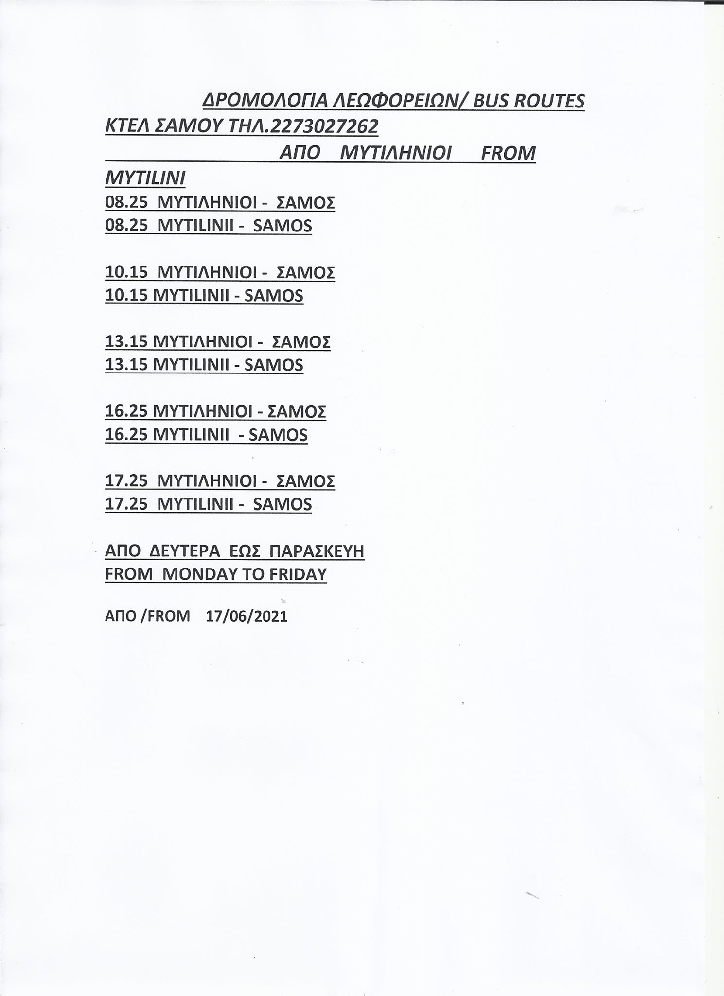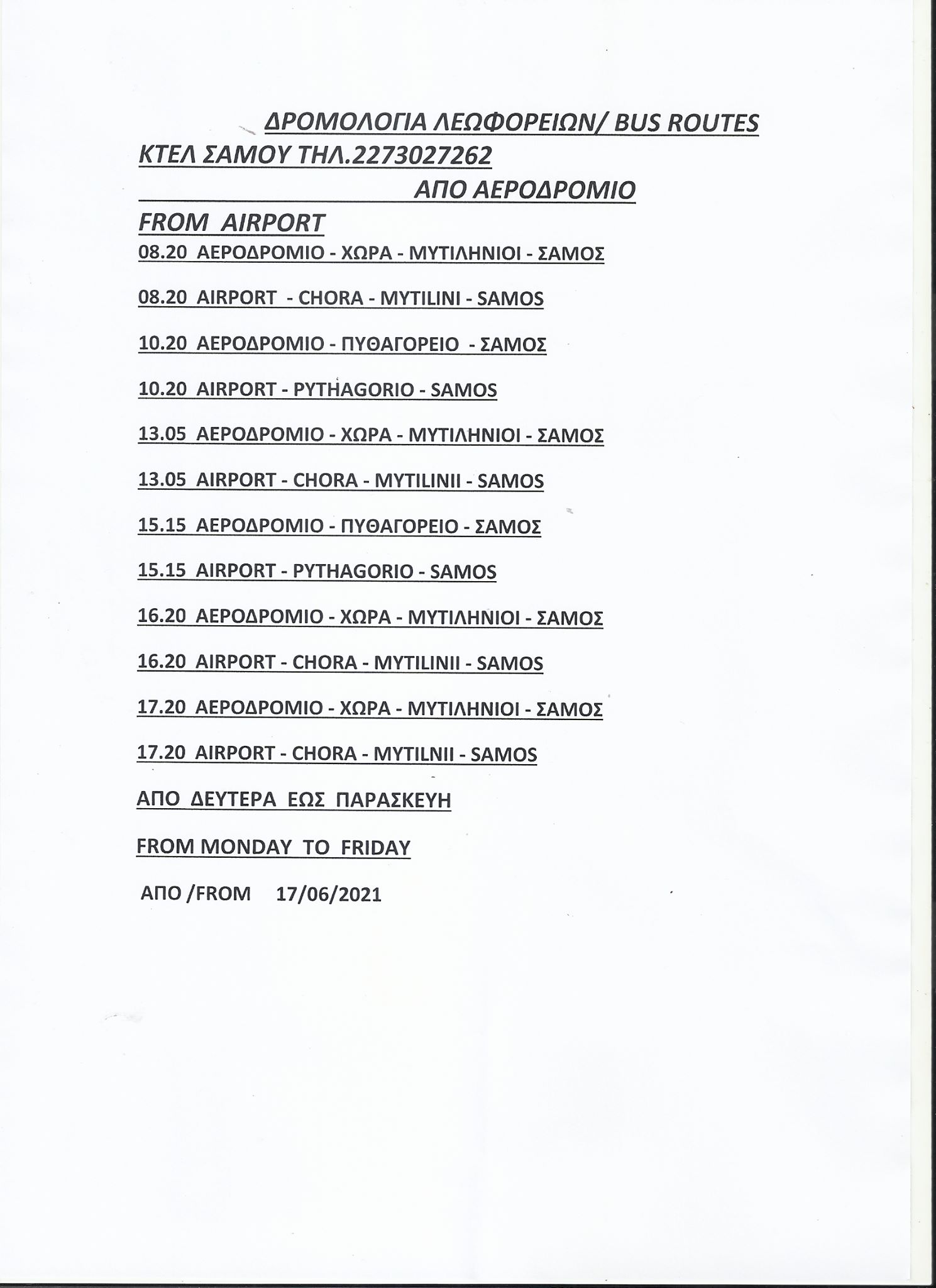 ΑΕΡΟΔΡΟΜΙΟ - ΧΩΡΑ - ΜΥΤΙΛΗΝΙΟΙ - ΣΑΜΟΣ: 08:25 - 9:55 - 11:25 - 12:40- 13:10 - 15:05 - 17:25 - 18:35