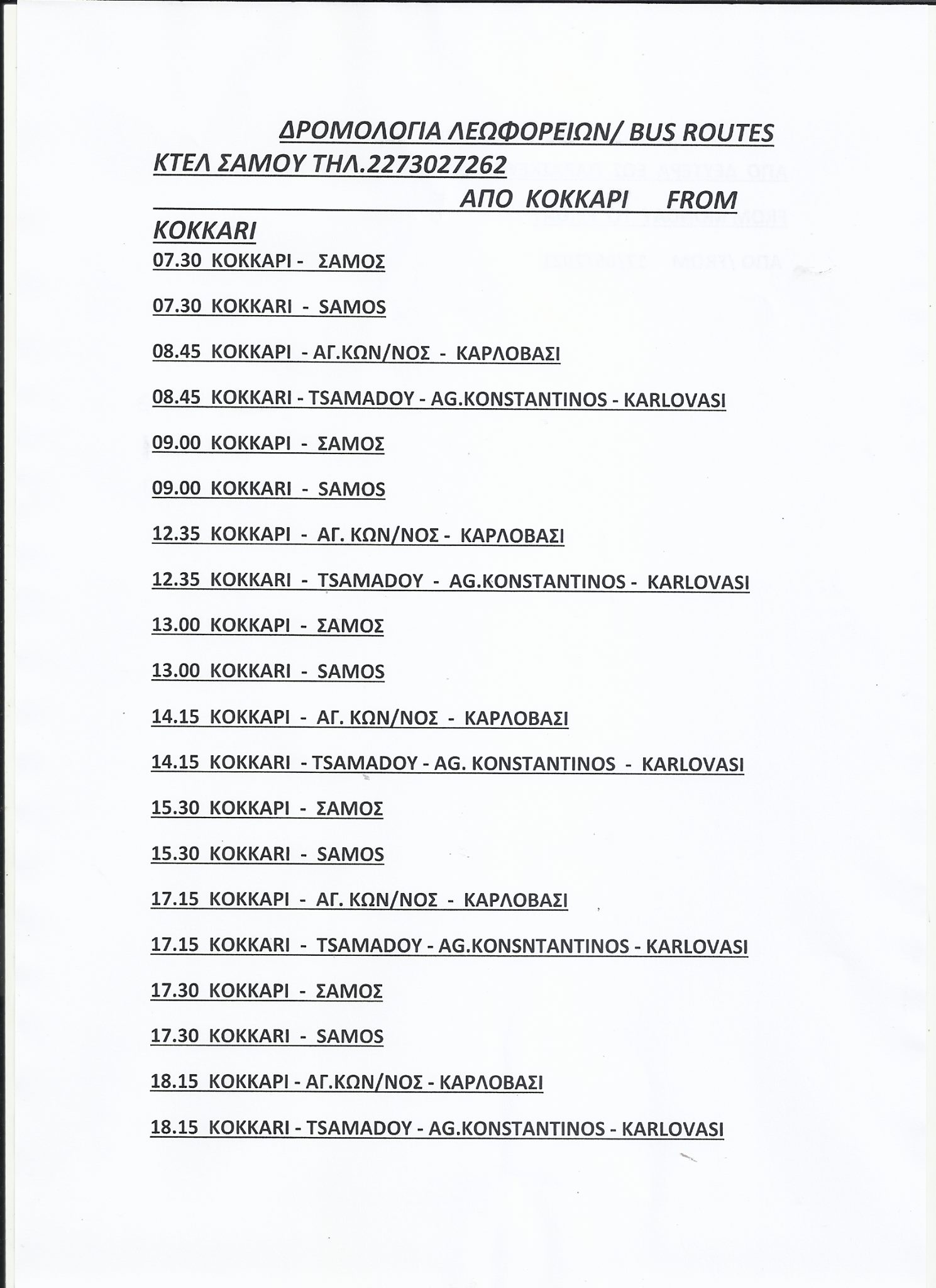 ΚΟΚΚΑΡΙ-ΛΕΜΟΝΑΚΙΑ-ΤΣΑΜΑΔΟΥ ΑΥΛΑΚΙΑ-ΤΣΑΜΠΟΥ-ΑΓ.ΚΩΝ/ΝΟΣ-ΚΑΡΛΟΒΑΣΙ: 08:30-11:00-12:20-14:00-17:00