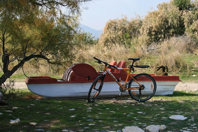 Ich strampelte langsam aus Ireon hinaus, fuhr über die Brücke, bog nach einem Kilometer Strasse zum ausgeschilderten Hera Tempel ab, weiter ging es auf einem extra für die Fussgänger und Fahrradfahrer angelegten Fahrradweg, direkt am Meer entlang, was für ein Luxus, autofrei und das Meer zur Seite, was will man mehr? Nach wenigen Minuten komme ich zu einer Taverne, mit einem grossen Biergarten einladend für einen Drink auf dem Heimweg denke ich mir. Tiganiou Bucht, ist der Hauptstrand von Pytahgorio, der sich kilometerweit vorbei beim Flughafen bis nach Ireon zieht. Es werden Liegen und Schirme vermietet.